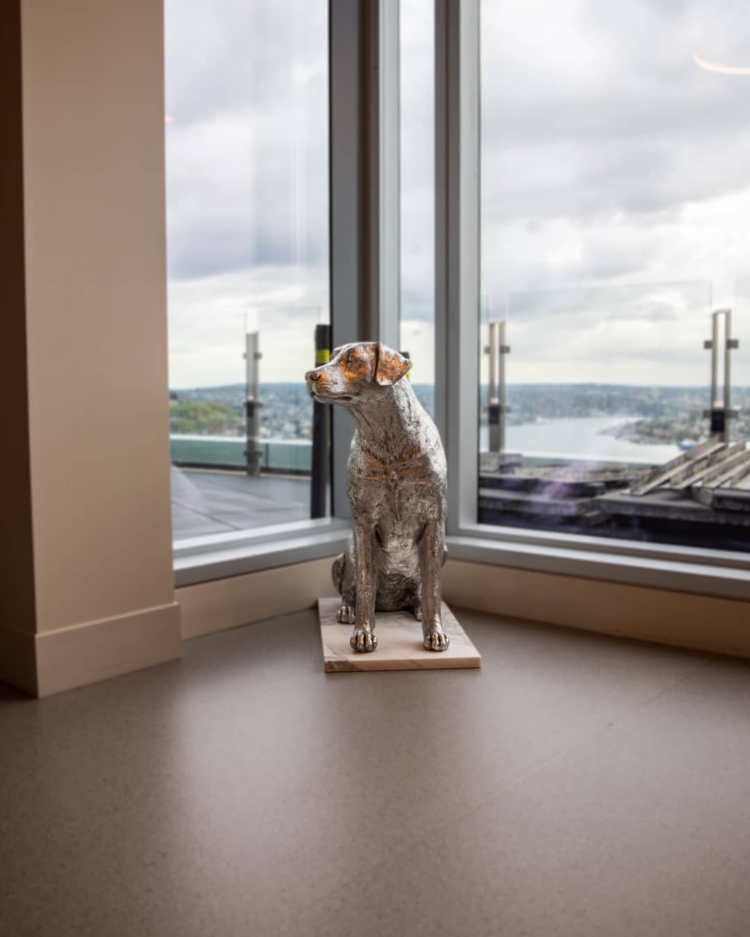 It’s yeah, we wanted it to reflect the sky. So the color is a reflection of the Seattle sky nine months out of the year. And even when it’s brilliantly sunny, it, it works with the reflection of the sky. But this is where we are. We’re up here in the sky. We’re facing west, looking over Elliot bay and looking past the new Amazon towers into, you know, the fairies coming in and out. We’re looking over at west Seattle and down through, into the port. And you know, from this perch all looks well with the world. Right? Right. Exactly. Seattle is in glorious form