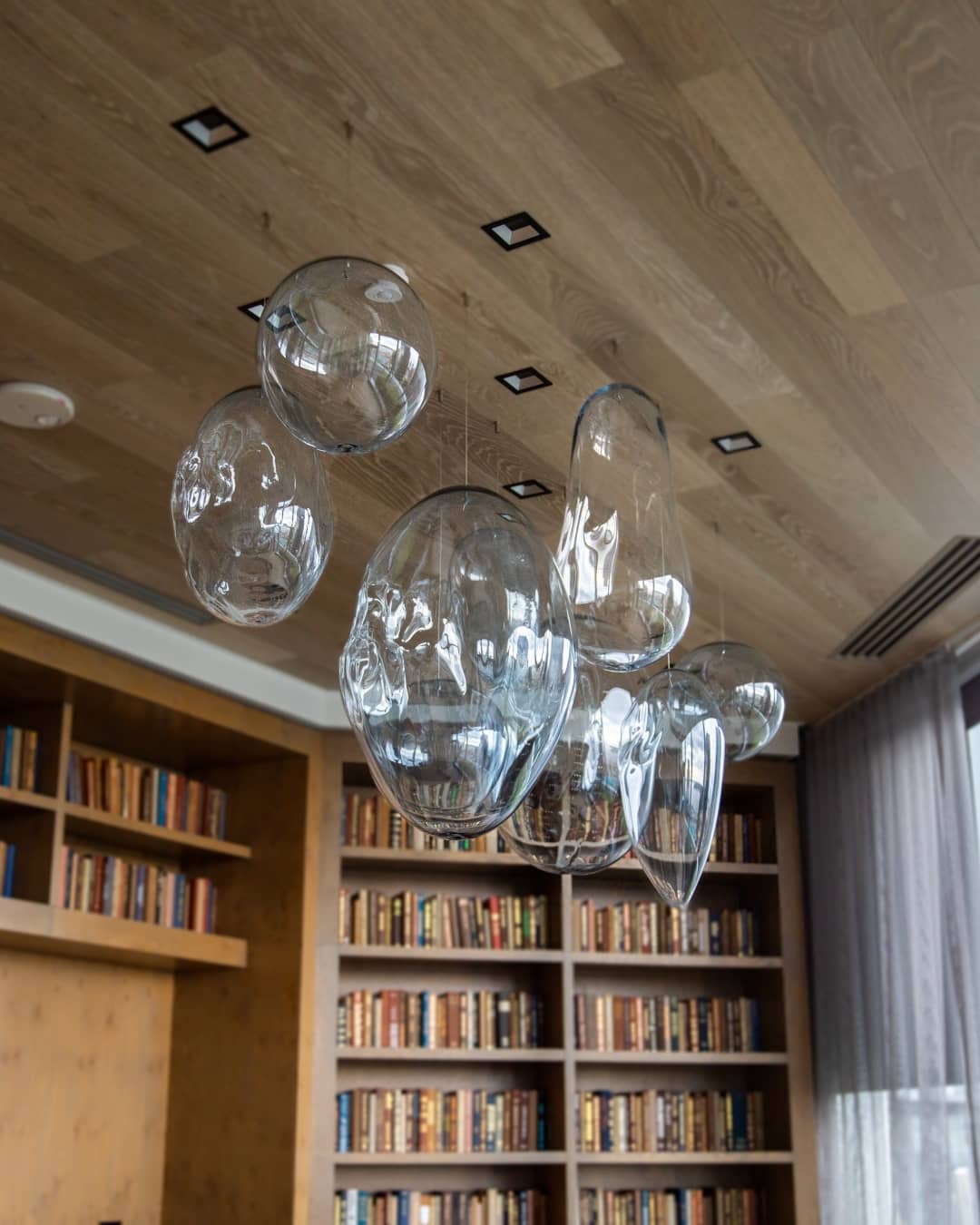 The, because of the shape of the building. It is not a perfectly square room. It kind of comes to a point, uh, as you enter, there are bookshelves along the left hand side and a large conference table with these beautiful chairs surrounding it. And then there is this breathtaking glass sculpture hanging from the ceiling. You
