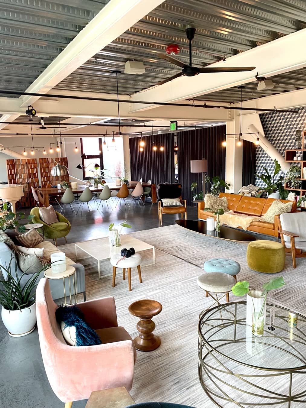 Every corner of the loft was used purposefully. From the bar when you entered, the furniture is set up in such a way that’s very inviting. There’s a white grand piano in the far corner and this long wooden table with these teardrop chairs in a very plush velvet. It was industrial, but inviting. Liz put a lot of thought into every square inch of the space.
