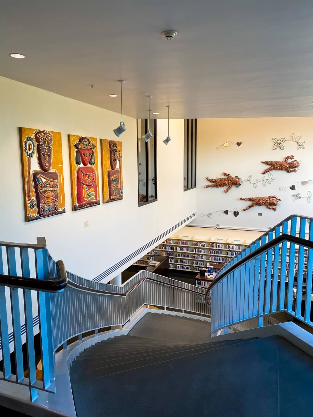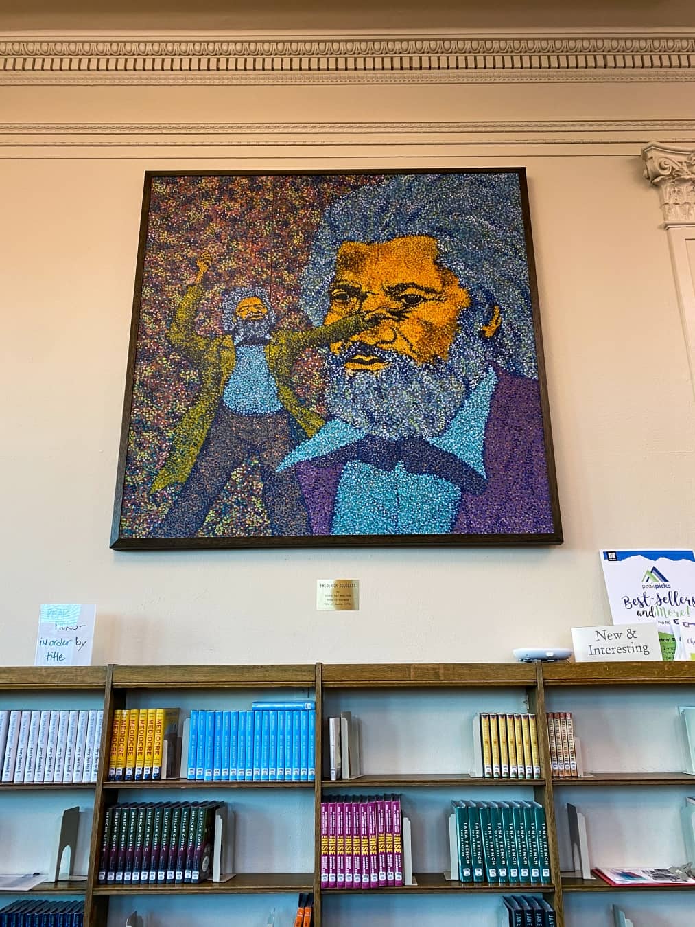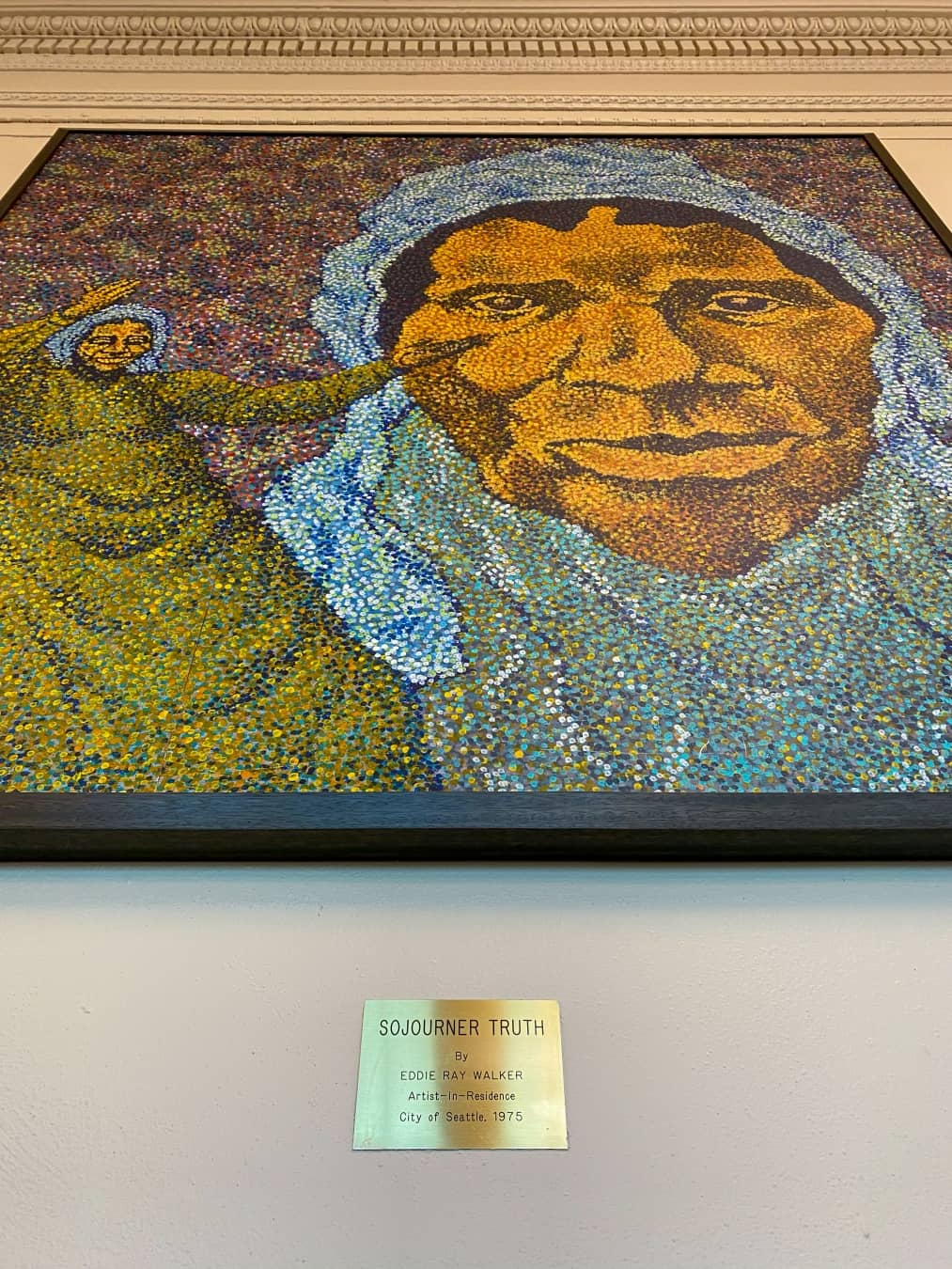 In the 1940s and ’50s, and definitely by the ’60s, the central district was a predominantly African American community and the residents of the city at that time ensured that this library would reflect the African American rich literary and artistic traditions. And so we are graced, these walls are graced with the artwork of brilliant artists of color. If you look behind you, that artwork on the wall, that’s the work of an award winning local black woman artist, Marita Dingus. And the two portraits of Sojourner Truth and Frederick Douglas were done by a local artist, Eddie Ray Walker, and the other artwork that adorns these walls, they reflect the rich cultural diversity that has always been found in the central district. And so it just enriches the soul to be in this space.