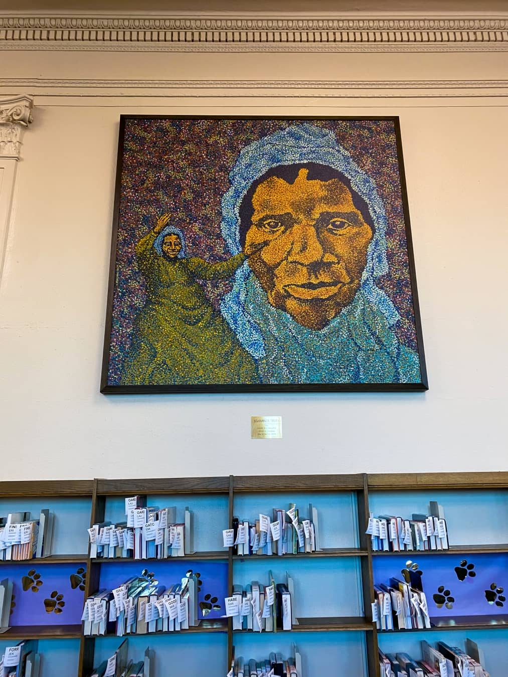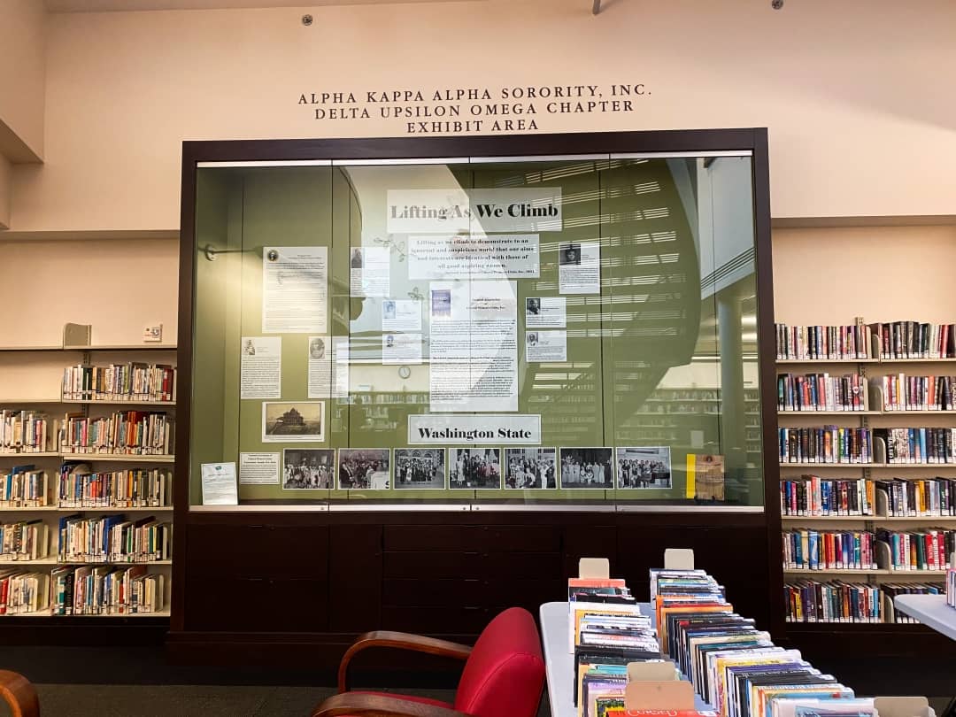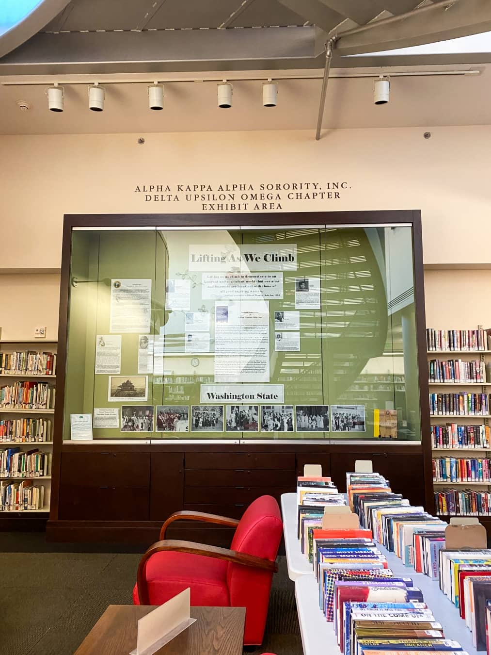 Yes, yes, yes. This exhibition space is always telling the African American story by African American women of this community. This sorority donated the … At that time, it was called the Negro Collection. It was in 1965 and the Alpha Kappa Alpha Sorority Delta Upsilon Omega Chapter, which is located here in Seattle, comprised of college educated African American women leaders in all kinds of fields and industries. These are all professional women that come together to serve community in a shared sisterhood. And it’s so inspiring to see that they have dedicated since 1965 their financial and volunteer hours to ensure that this display is always adorned with black history, black art and black culture. It is truly an inspiration. This is my absolute favorite spot, because it was in a space like this that drew me to African American history as a small child, as a six-year-old, seven-year-old girl, going to the library, I was drawn to displays like this that allowed me to see myself and see who I could be.