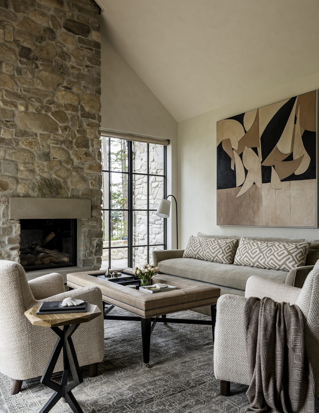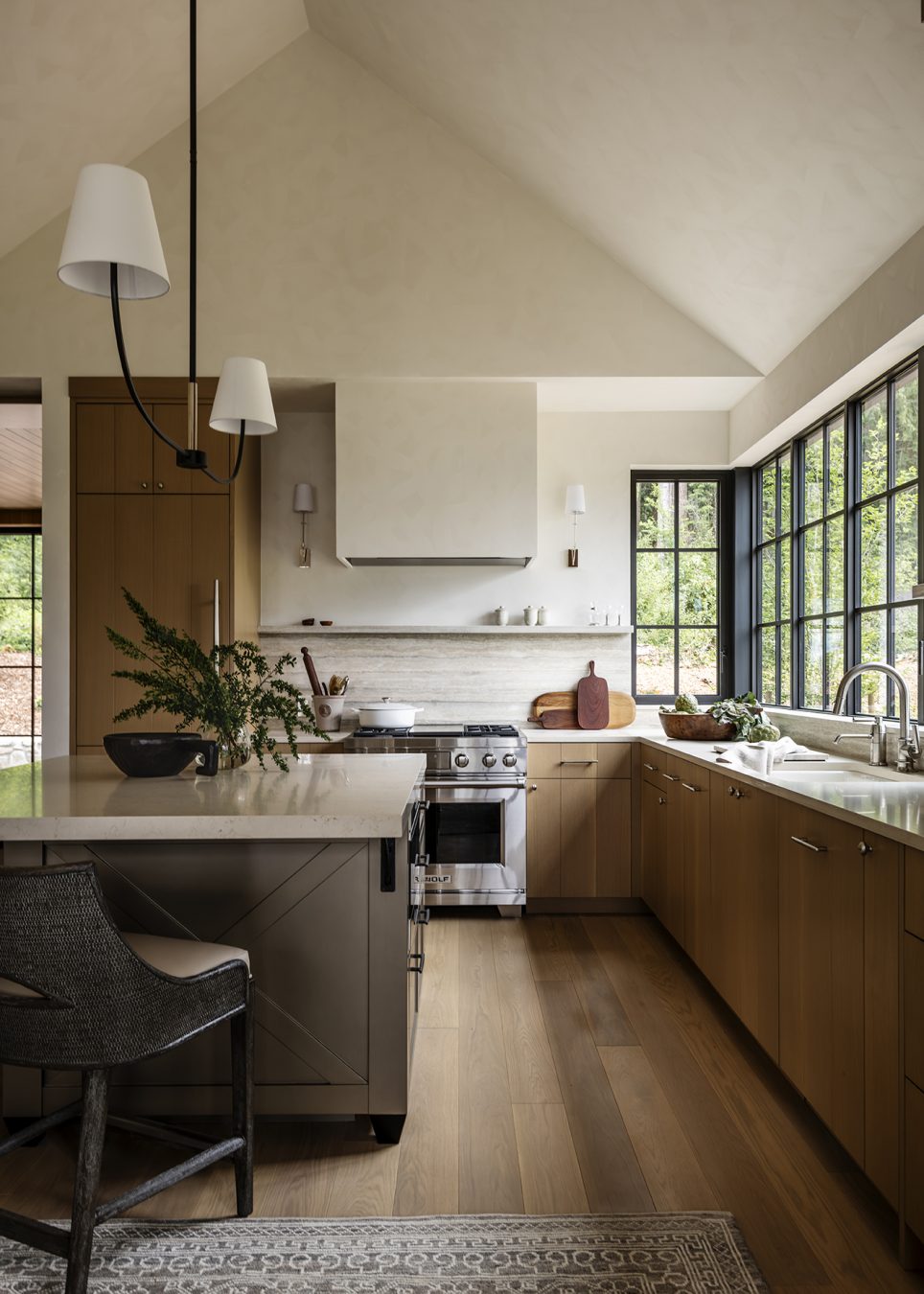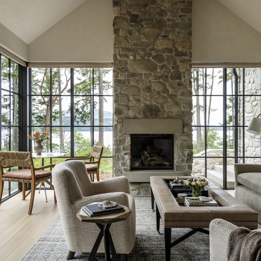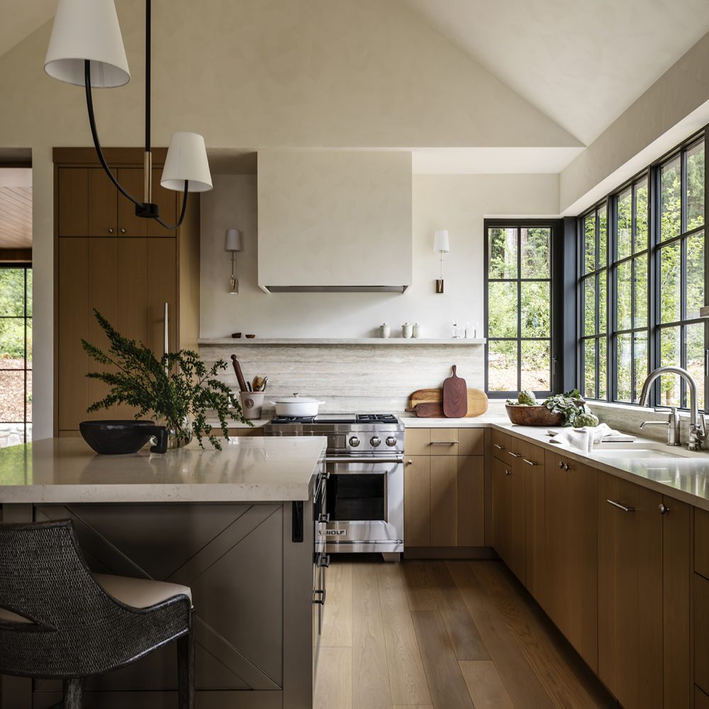 Every detail of the home was thoughtfully crafted to feel timeless. The exterior features reclaimed Italian rockery with oversized mortar joints, a material echoed in the interior fireplace. Vein-cut travertine anchors the kitchen backsplash, while lime-washed paint, oak casework, and bronze hardware create a warm, tactile connection to the surrounding environment. The interiors invite nature in, blending simplicity with refinement.