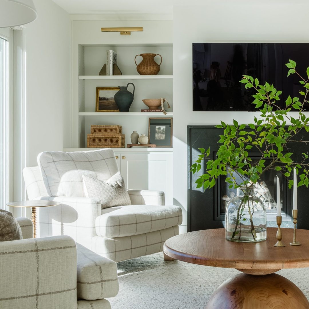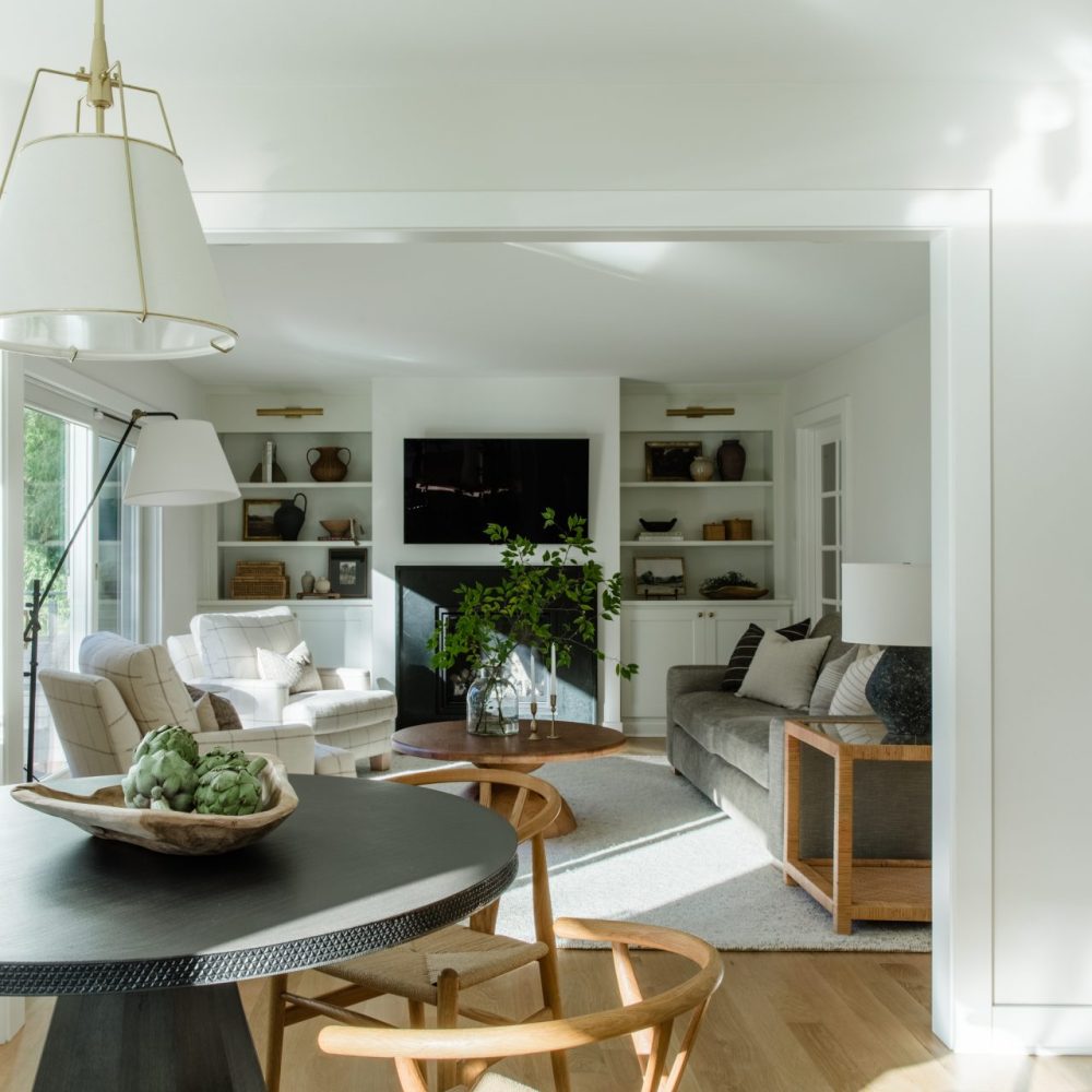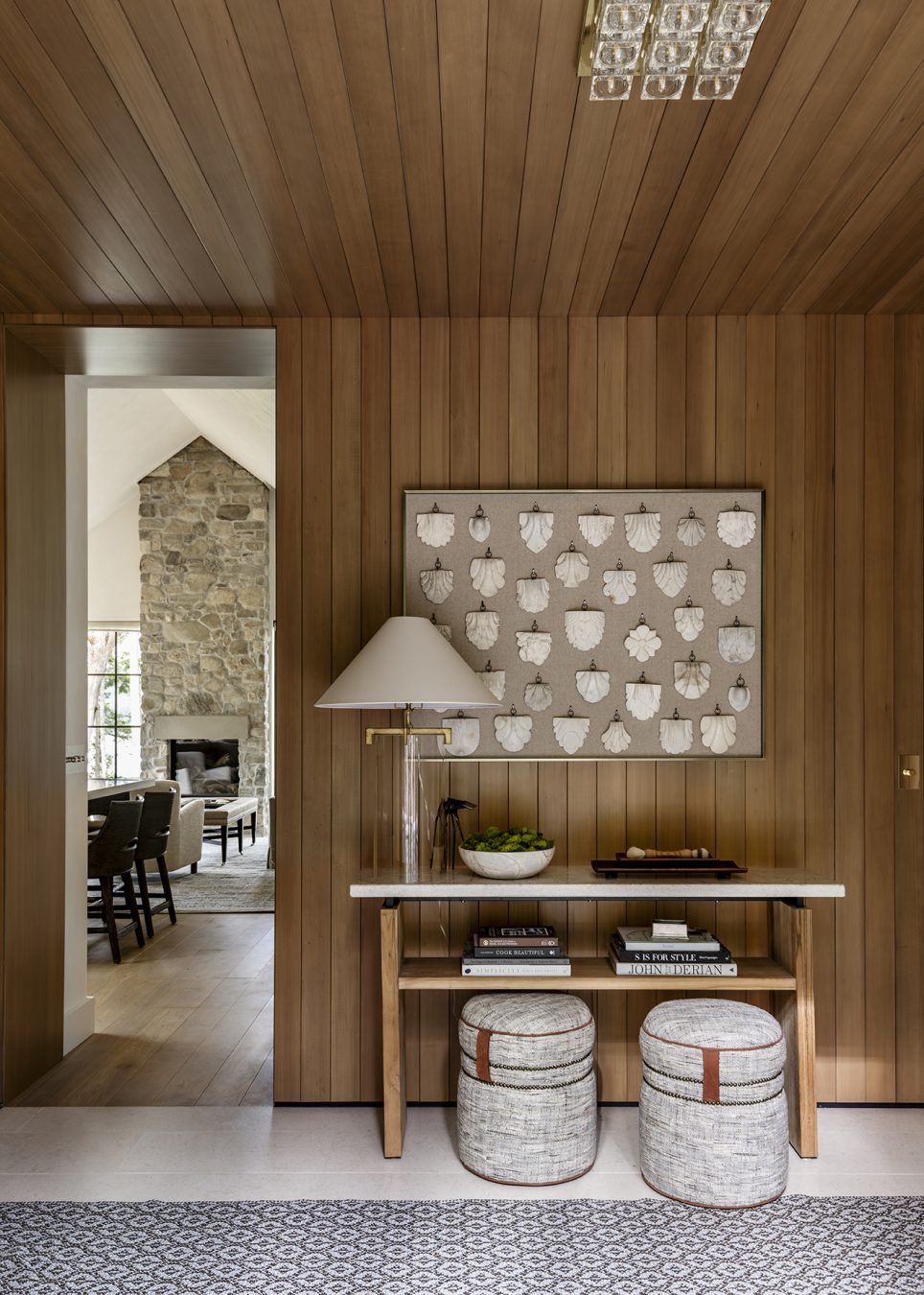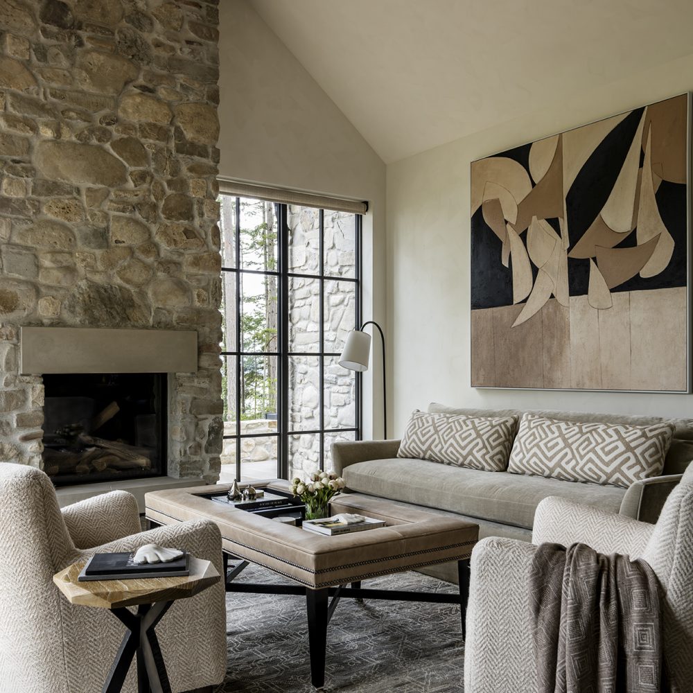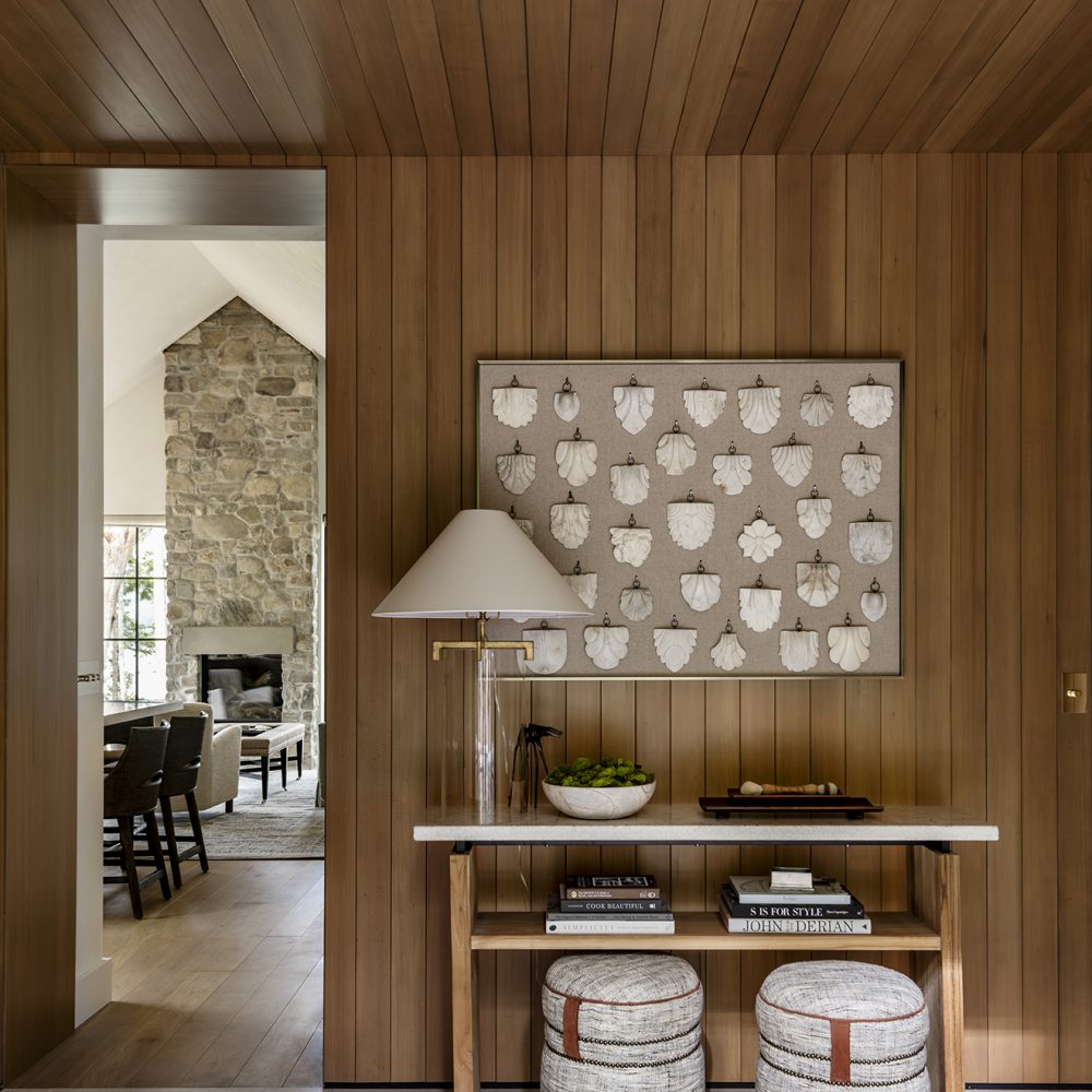 Every detail of the home was thoughtfully crafted to feel timeless. The exterior features reclaimed Italian rockery with oversized mortar joints, a material echoed in the interior fireplace. Vein-cut travertine anchors the kitchen backsplash, while lime-washed paint, oak casework, and bronze hardware create a warm, tactile connection to the surrounding environment. The interiors invite nature in, blending simplicity with refinement.