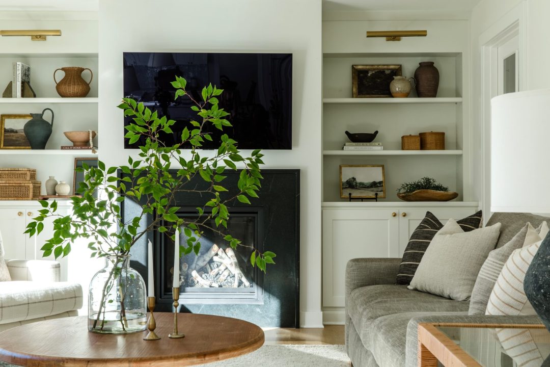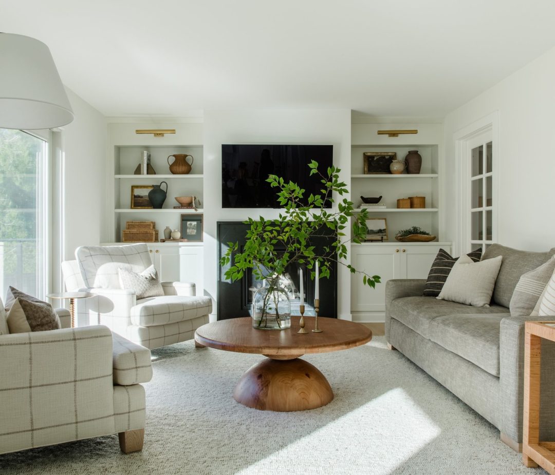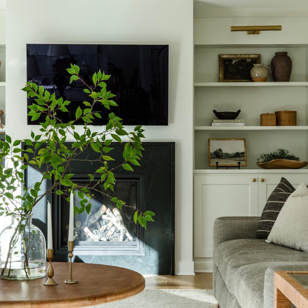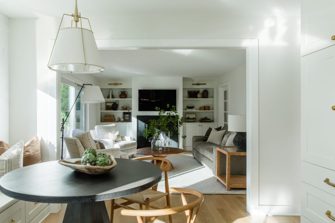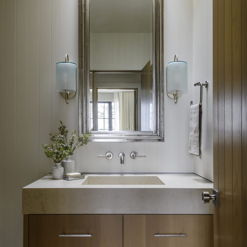 Every detail of the home was thoughtfully crafted to feel timeless. The exterior features reclaimed Italian rockery with oversized mortar joints, a material echoed in the interior fireplace. Vein-cut travertine anchors the kitchen backsplash, while lime-washed paint, oak casework, and bronze hardware create a warm, tactile connection to the surrounding environment. The interiors invite nature in, blending simplicity with refinement.