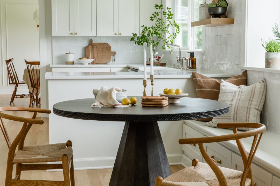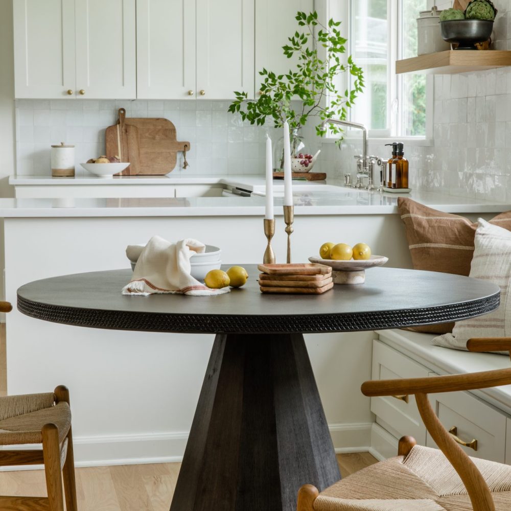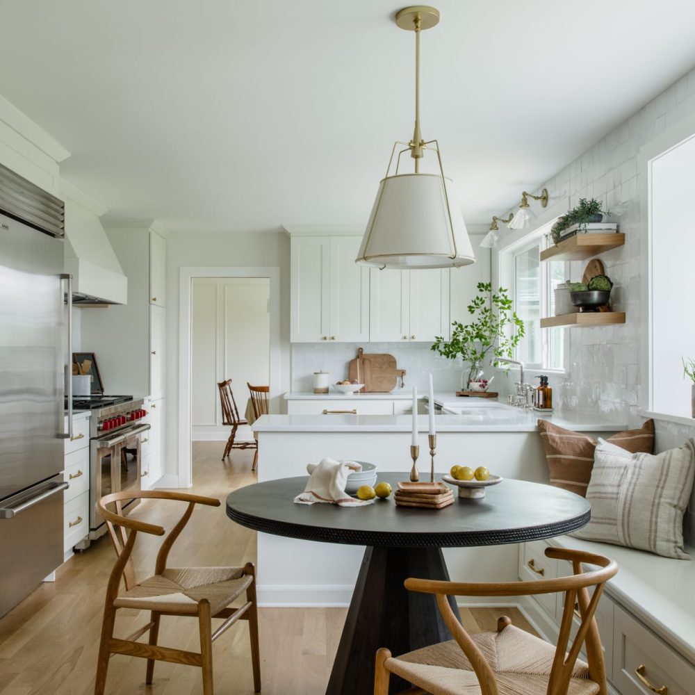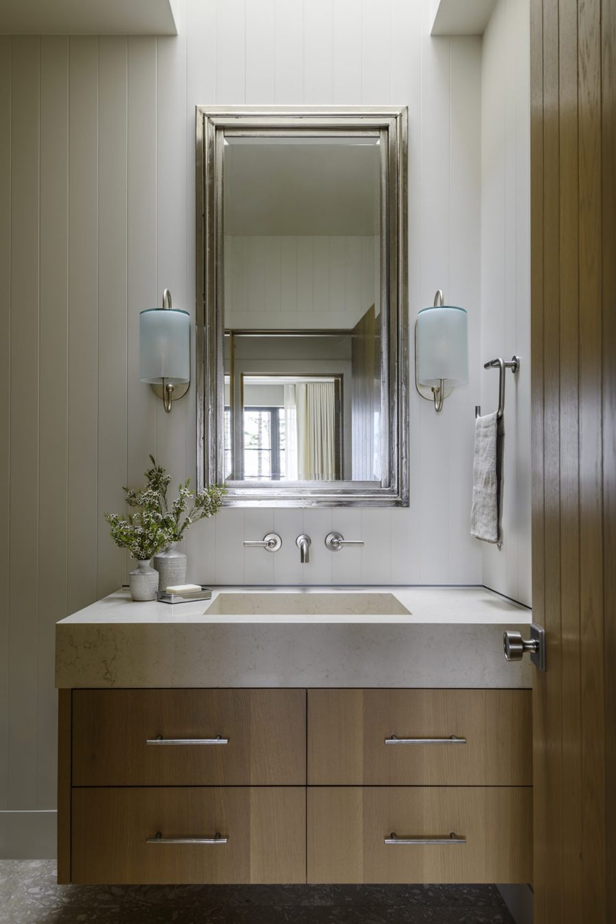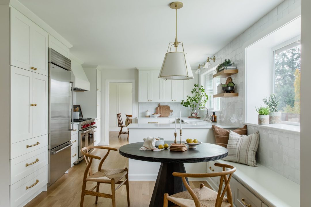 Every detail of the home was thoughtfully crafted to feel timeless. The exterior features reclaimed Italian rockery with oversized mortar joints, a material echoed in the interior fireplace. Vein-cut travertine anchors the kitchen backsplash, while lime-washed paint, oak casework, and bronze hardware create a warm, tactile connection to the surrounding environment. The interiors invite nature in, blending simplicity with refinement.