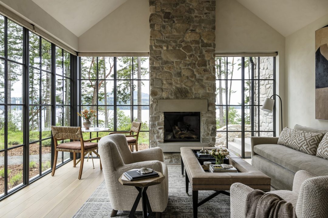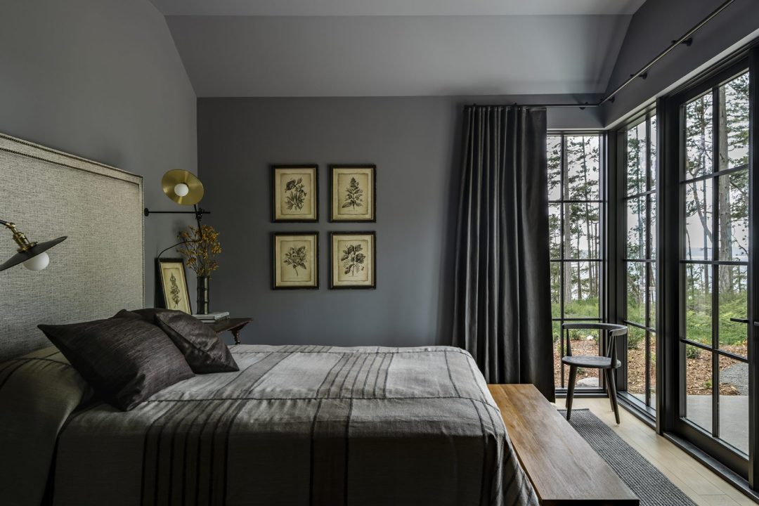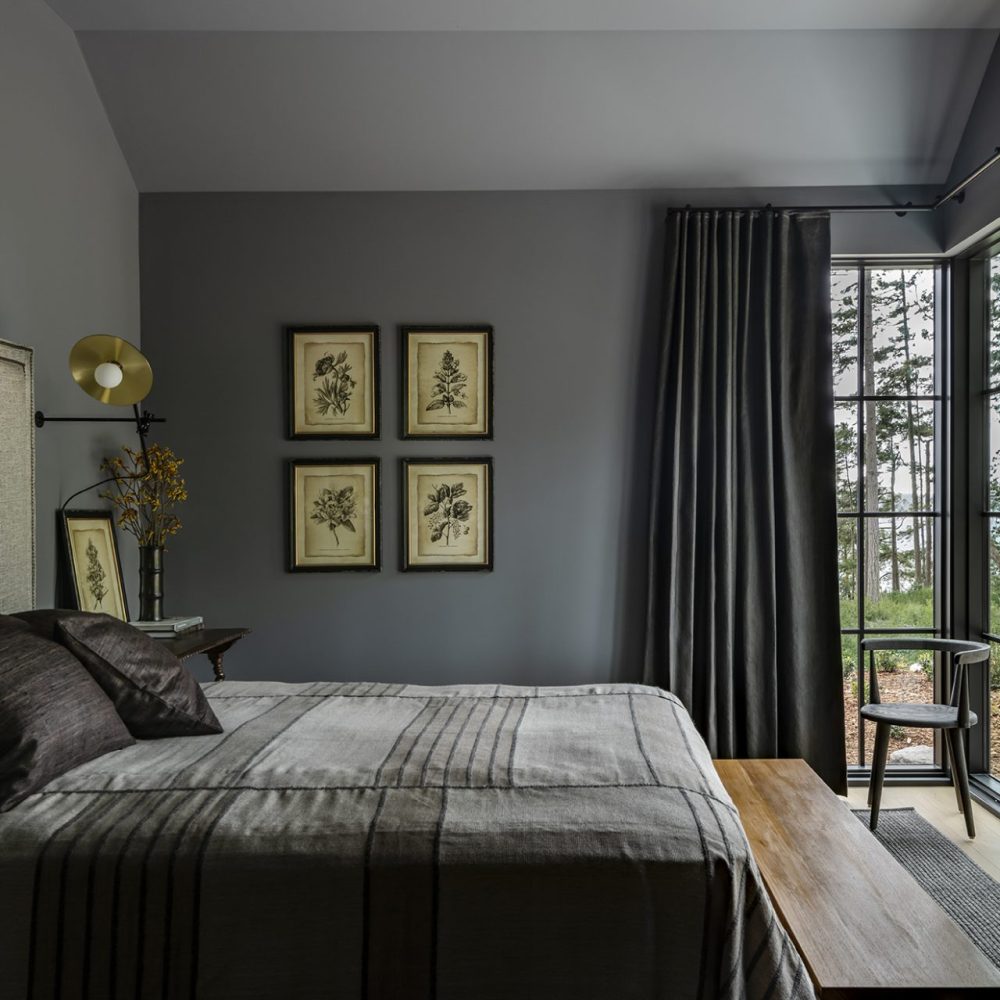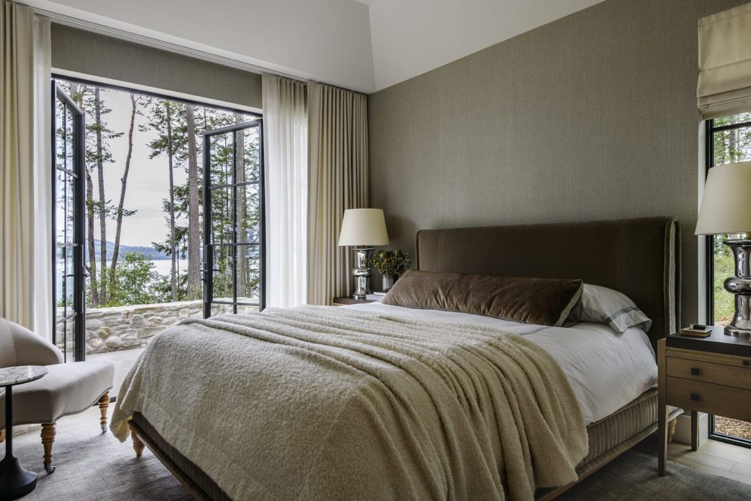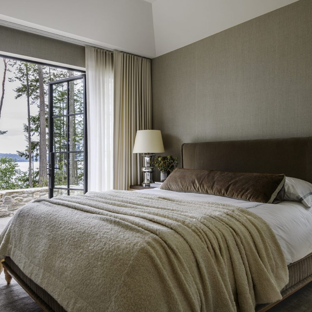 The great room and primary bedroom capture expansive views of Discovery Bay, filling the spaces with natural light during summer. Furnishings include a custom sofa, leather ottoman, boucle armchairs, and a vintage wool rug sourced in Seattle. The primary bedroom pairs a tufted mohair bed with linen wallpaper, while the guest room embraces moody winters with “Dior Gray” walls and a fireplace with blackened steel accents. This blend of antique and custom pieces reflects the collaborative vision of a European-inspired sanctuary, thoughtfully designed for family, friends, and creative living.