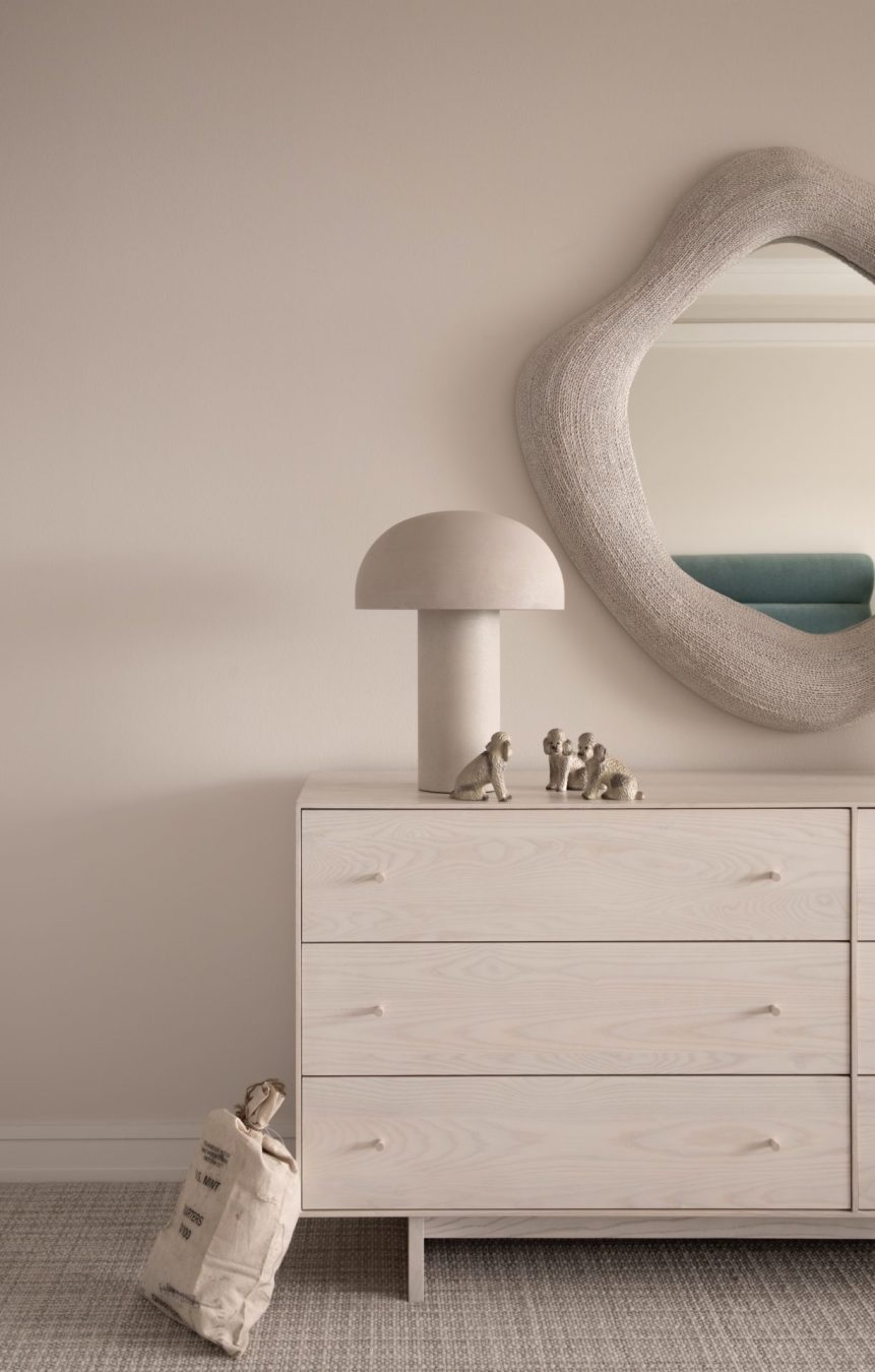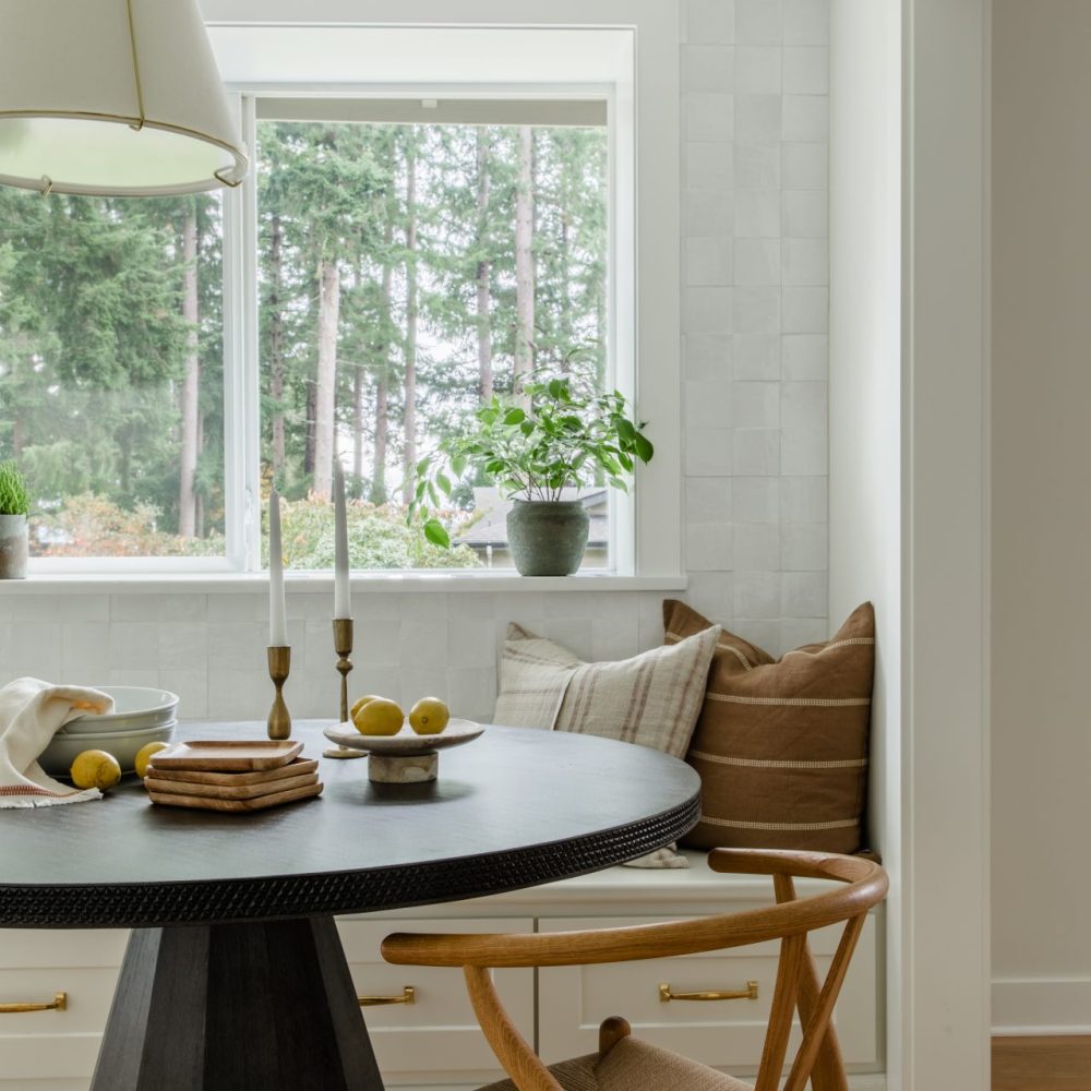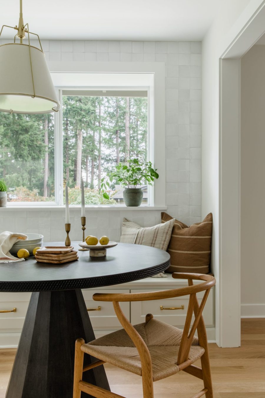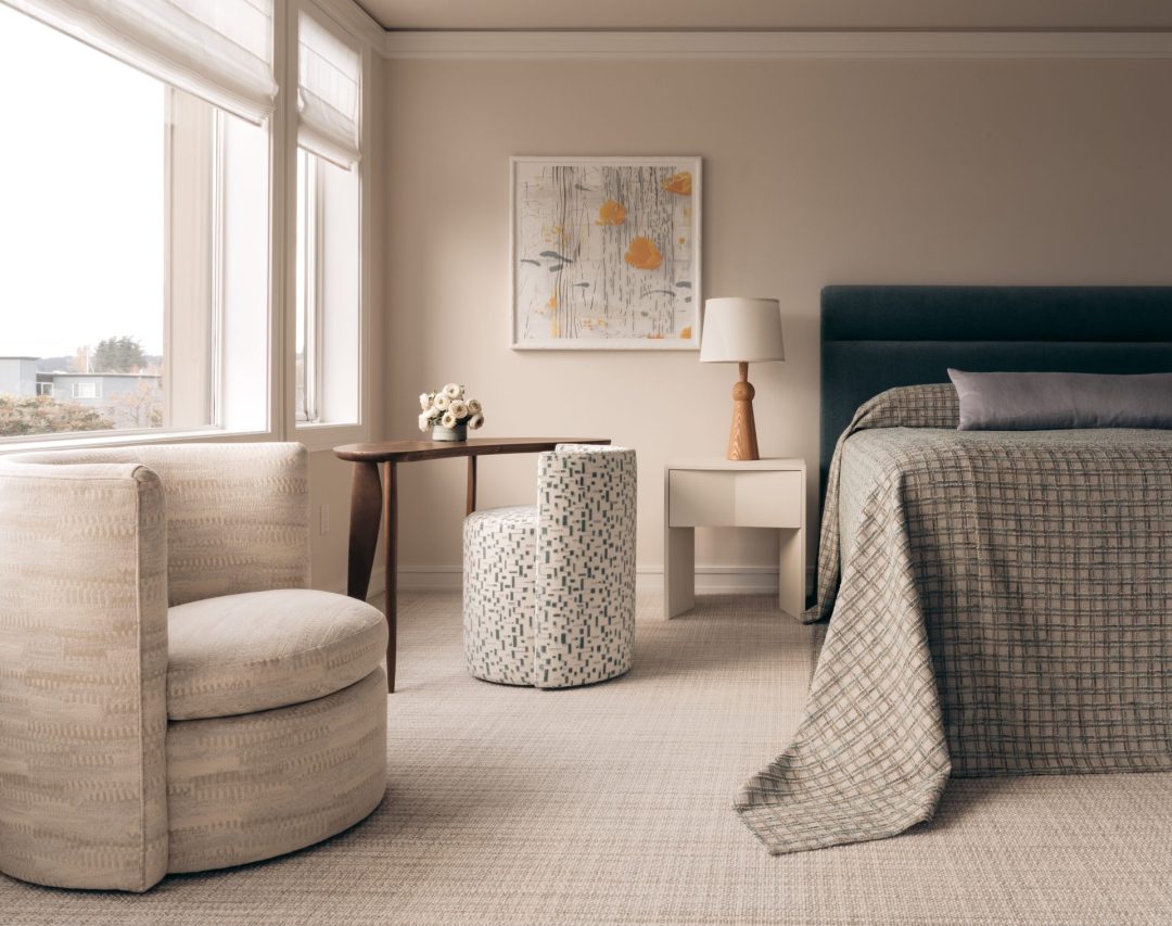 The great room and primary bedroom capture expansive views of Discovery Bay, filling the spaces with natural light during summer. Furnishings include a custom sofa, leather ottoman, boucle armchairs, and a vintage wool rug sourced in Seattle. The primary bedroom pairs a tufted mohair bed with linen wallpaper, while the guest room embraces moody winters with “Dior Gray” walls and a fireplace with blackened steel accents. This blend of antique and custom pieces reflects the collaborative vision of a European-inspired sanctuary, thoughtfully designed for family, friends, and creative living.