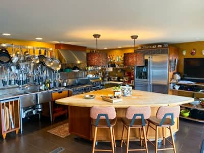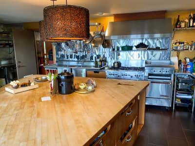 When you walk into their house, you’re immediately struck by the amazing view of the Olympic mountains. And then as you turn the corner, you’re in the kitchen and this kitchen is exactly what a professional chef would want. It is dialed in. It’s not a minimalist kitchen. We’ll put it that way. His kitchen is filled with everything that he loves, and there’s very little counter space left, but everything has a purpose.