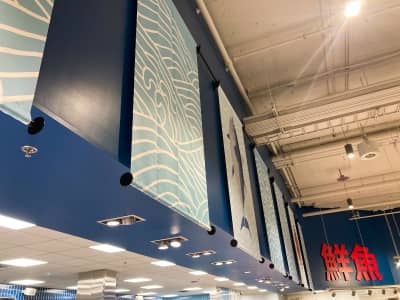 So when I look at these four beautiful banners up above the produce section, you nailed it. They have this great texture to it with these designs. They’re beautiful, but I wouldn’t know that’s an actual Japanese artist. That’s really cool.