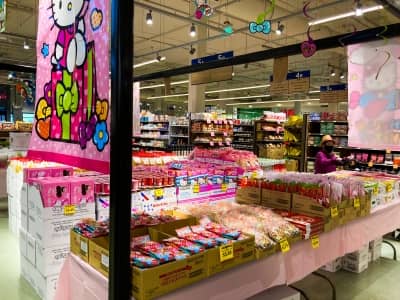 So we’re in our, what we deemed as our retail street. Here, this is all the products that are much more exciting in a way. We have snacks to our left here with just the tons of varieties of different Asian snacks, rice cake, rice crackers, mochi, all those different flavors, Pocky. This is a more fun environment. I think you talked to lots of kids who grew up in Uwajimaya and this is what I remember. You go to the snack department and you pick out all your [foreign language 00:17:42] and your rice crackers. [crosstalk 00:17:44] Yeah, exactly. So we really want this to be a kind of a very different feeling than when you’re buying snacks and say, you’re buying your fish. So we call this kind of our retail street. So it starts with the Saki and beer and beverages, all of the Japanese teas and different specialty beverages there. It moves into our snack selection, which is piled high with products and a little bit on the messy side where it’s just a different feel.