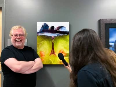 This is some pictures of blueberries, but the blueberries are bigger than a basketball here, in an actual size, in the photo. Now, if I had just taken one picture of this, the amount that’s in focus, this would have been incredibly shallow, incredibly shallow. This is about 500 photos. And so, we take 500 photos and then we use software to put them together. Well, it’s funny. They’re so big. And out of context, a lot of people don’t realize they’re blueberries. They’ll say, “What is that?” Or, this?