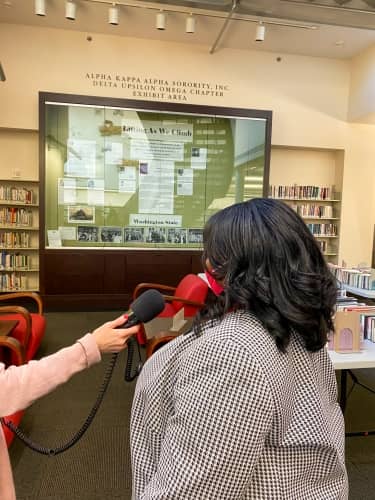 Yes, yes, yes. This exhibition space is always telling the African American story by African American women of this community. This sorority donated the … At that time, it was called the Negro Collection. It was in 1965 and the Alpha Kappa Alpha Sorority Delta Upsilon Omega Chapter, which is located here in Seattle, comprised of college educated African American women leaders in all kinds of fields and industries. These are all professional women that come together to serve community in a shared sisterhood. And it’s so inspiring to see that they have dedicated since 1965 their financial and volunteer hours to ensure that this display is always adorned with black history, black art and black culture. It is truly an inspiration. This is my absolute favorite spot, because it was in a space like this that drew me to African American history as a small child, as a six-year-old, seven-year-old girl, going to the library, I was drawn to displays like this that allowed me to see myself and see who I could be.