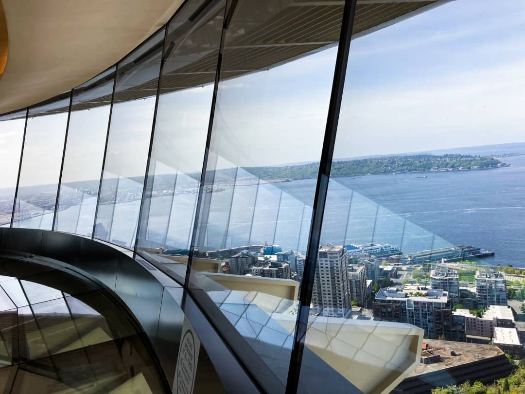Okay. We walk outside and you see the city displayed before you. And then we turn around looking back towards the observation deck. You notice this deep gold paint around the outside of the Space Needle.