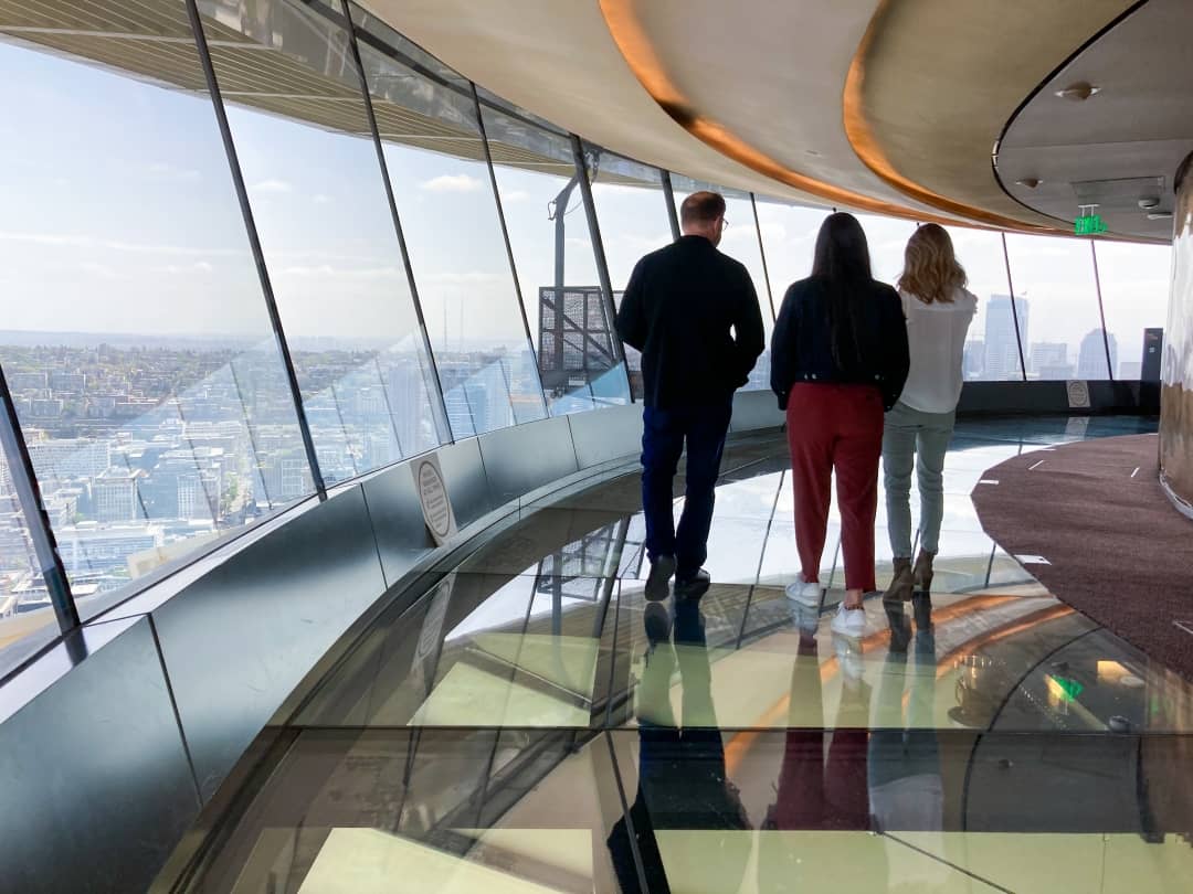 So to explain the way the Space Needle is constructed is you come up to the top observation deck and then to get to the rotating glass floor, you actually have to descend a floor down this beautiful staircase. As we walk down, you’re going to hear a little bit of piano music in the background. The feeling that I got walking down the stairs was almost like we were on a cruise ship because now we’re looking at this steel black wall.